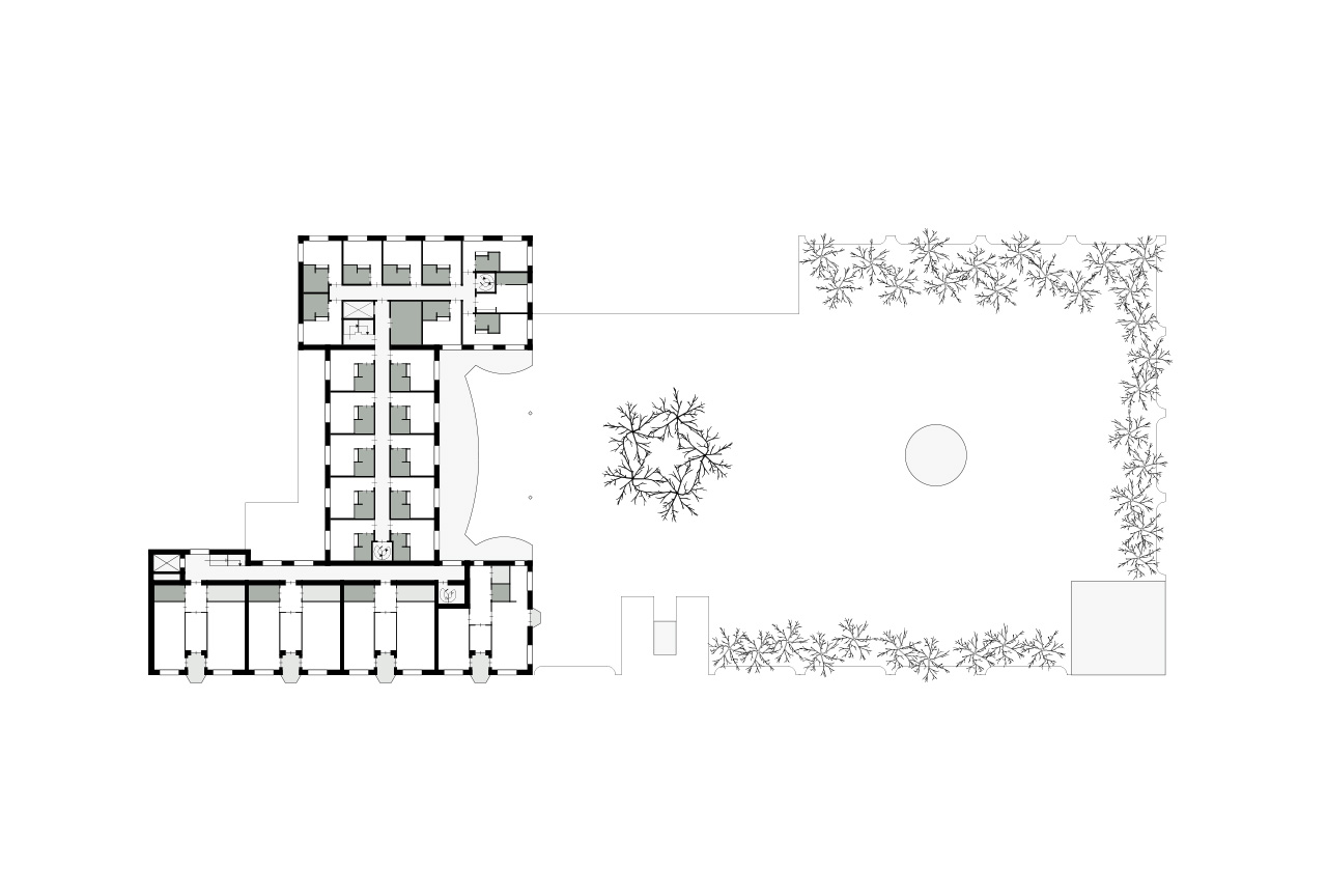 A compact building housing the hotel and the homes completes the adjacent block and provides a backdrop for the roof park. The hotel restaurant and a café are located next to the park.