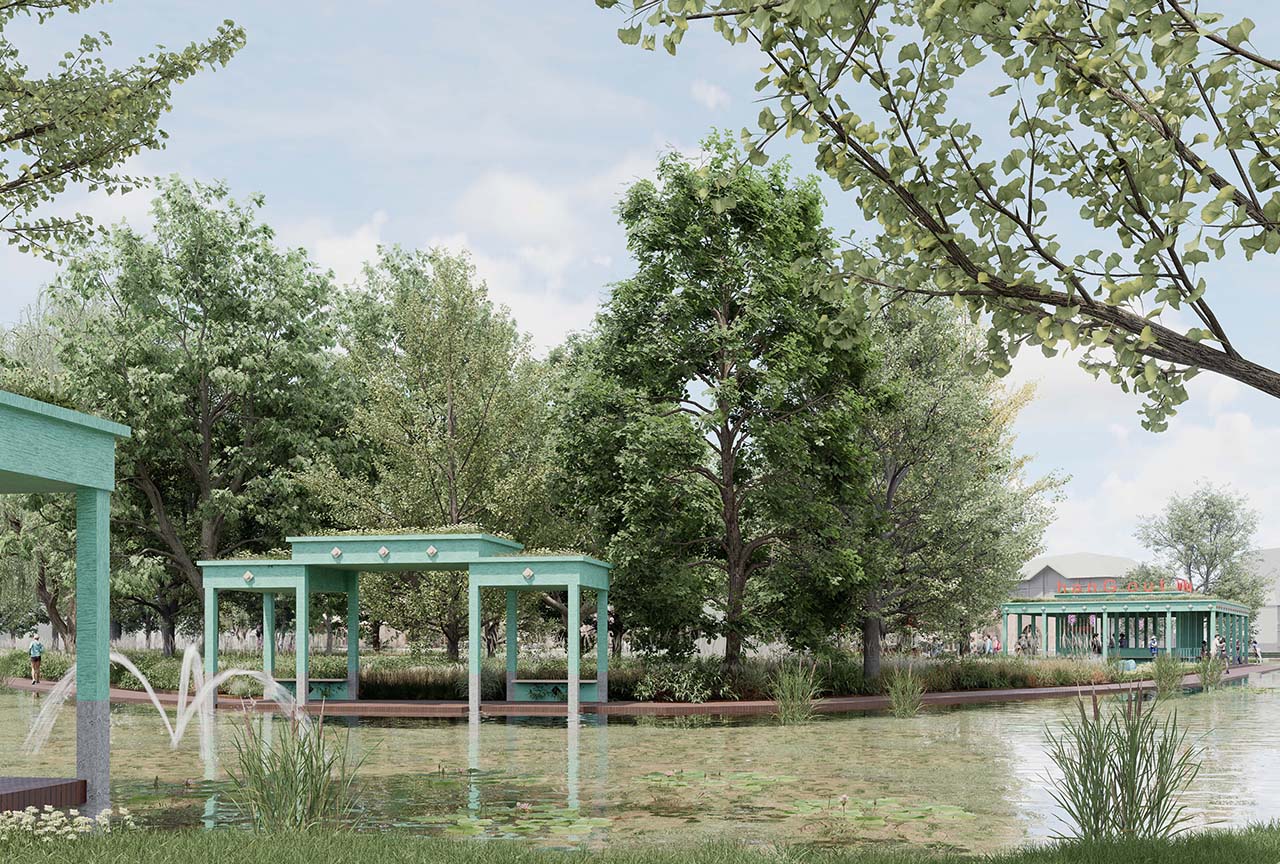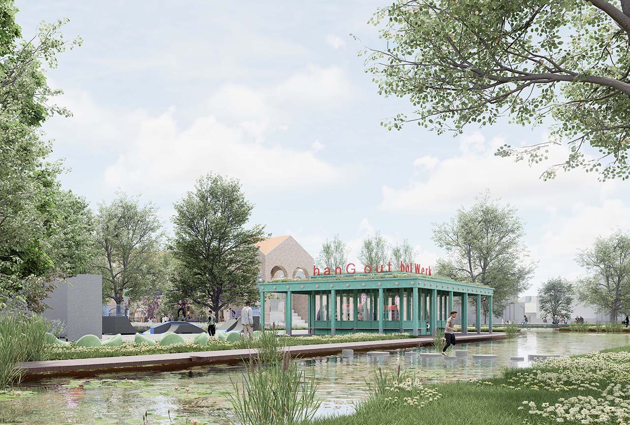 Zocher’s notion of ‘garden gems’ is given new meaning. Smaller buildings, such as a youth club, fishing piers and a gazebo, may be located in the park. At the corner of the roof park is a prominent ‘city gem’ with a staircase leading up to the park. This fits into a diagonal pedestrian route from the canal park to the Koemarkt and gives the design its name: Sheep Gate.