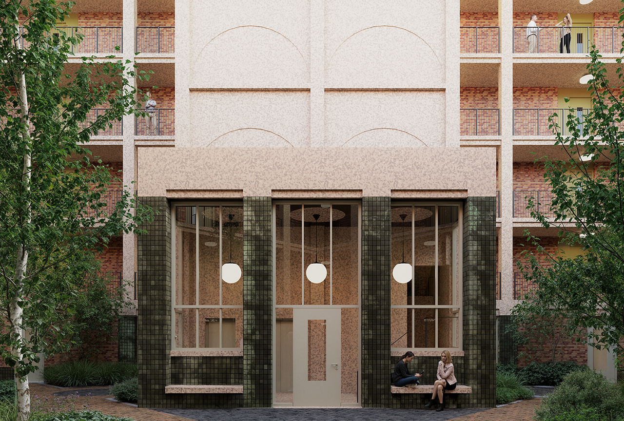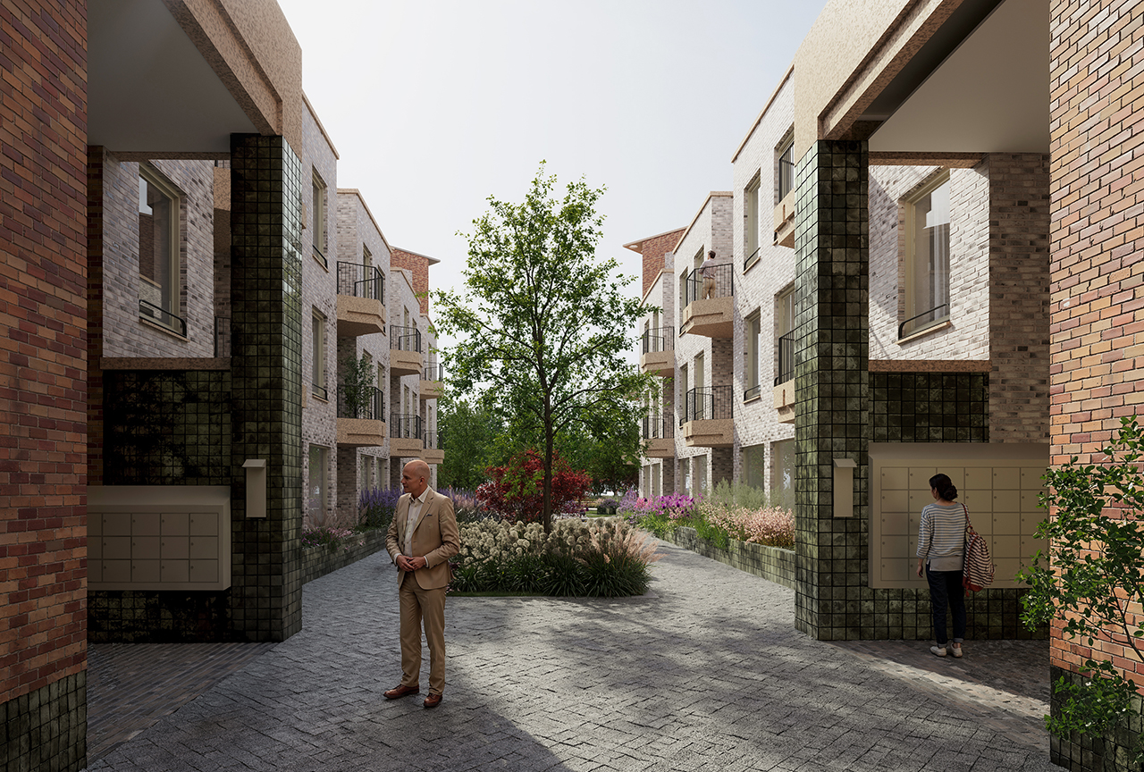 The blocks have a similar layout. The homes face a triangular court, on which all lifts, stairs, galleries, and front doors are located. It is a semi-private space based on residential palazzi, such as are common in Italy.